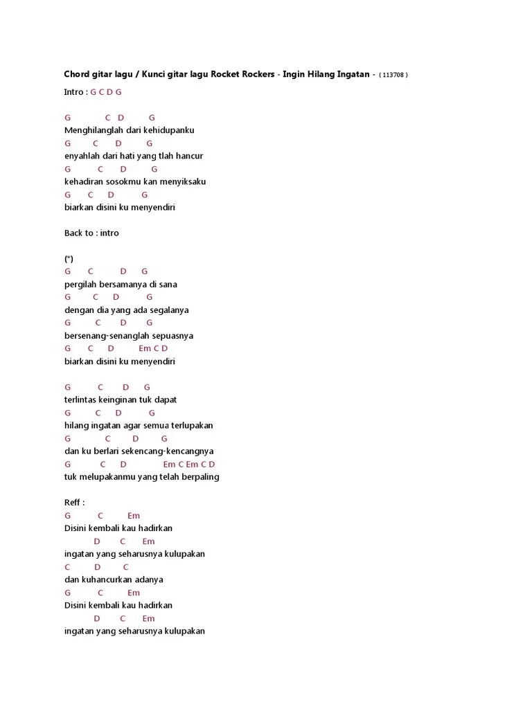 Chord gitar dan lirik lagu ingin hilang ingatan yang dipopulerkan oleh rocket rockers. Chord ingin hilang ingatan, chord ini mudah dimainkan di alat musik gitar, piano, ukulele, bass dan lainnya yang disatukan menjadi . Lirik dan kunci gitar lagu 'ingin hilang ingatan' dari rocket rockers lagu ingin hilang ingatan termasuk album better season. G c d g g c d g menghilanglah dari kehidupanku. Download lagu kunci gitar rocket rockers ingin hilang ingatan 3.8 mb, download mp3 & video kunci gitar rocket rockers ingin hilang ingatan terbaru, .